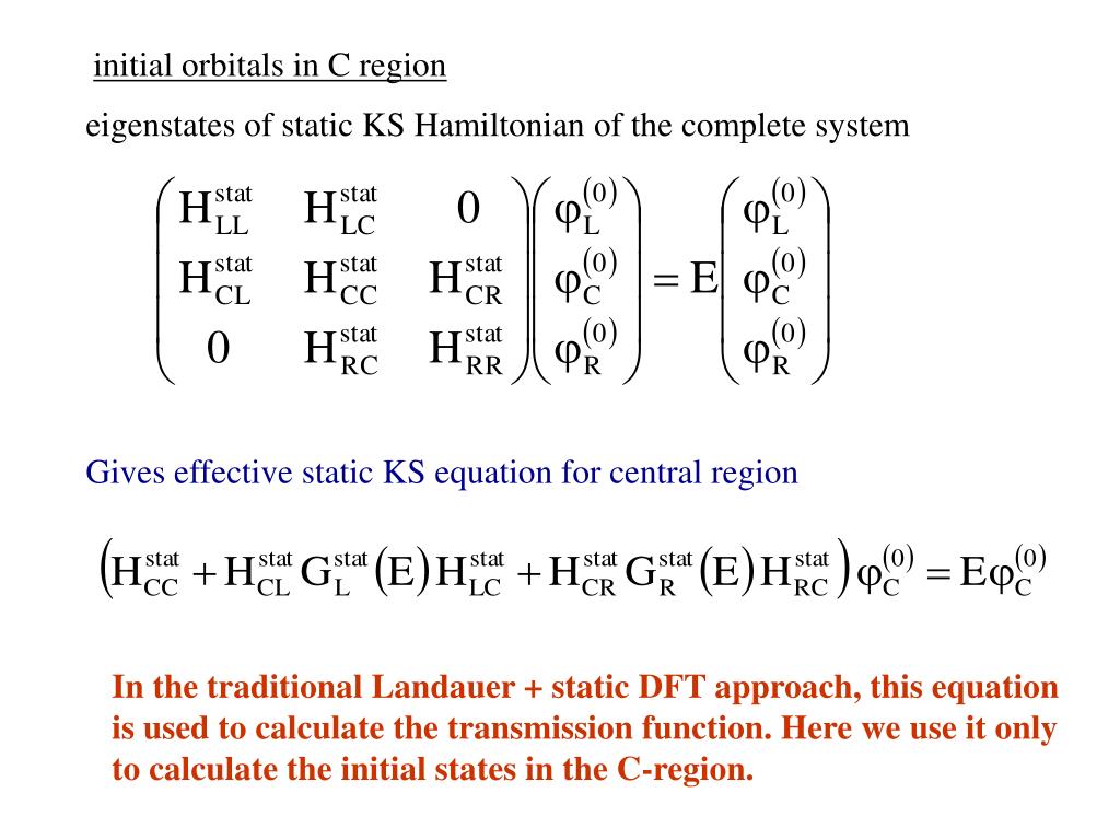 initial orbitals in C region eigenstates of static KS Hamiltonian of the complete system Gives effective static KS equation for central region In the traditional Landauer + static DFT approach, this equation is used to calculate the transmission function. Here we use it only to calculate the initial states in the C-region.