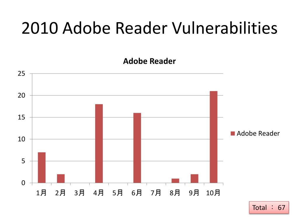 20101025 資安新聞簡報. 報告 者:劉旭哲 、 莊承恩、曾家雄. Adobe Reader X. 報告者:劉旭哲. 1999~2010. 2010 Adobe Reader Vulnerabilities. Total : 67. July, Adobe shared an example of a new mitigation technology Adobe Reader Protected Mode Oct, Adobe showed the technology about it. Sandbox. Sandbox.