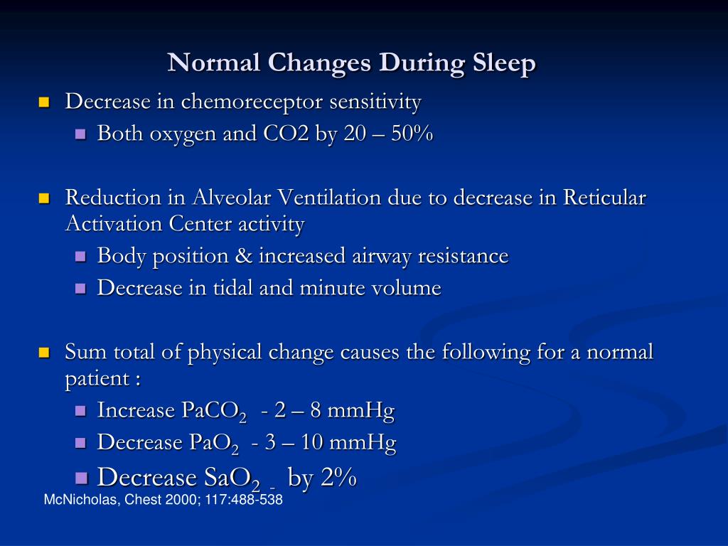Normal Changes During Sleep • Decrease in chemoreceptor sensitivity • Both oxygen and CO2 by 20 – 50% • Reduction in Alveolar Ventilation due to decrease in Reticular Activation Center activity • Body position & increased airway resistance • Decrease in tidal and minute volume • Sum total of physical change causes the following for a normal patient : • Increase PaCO2 - 2 – 8 mmHg • Decrease PaO2 - 3 – 10 mmHg • Decrease SaO2 - by 2% McNicholas, Chest 2000; 117:488-538