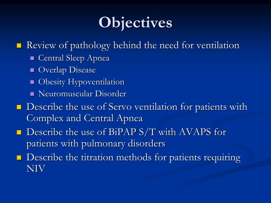 Objectives • Review of pathology behind the need for ventilation • Central Sleep Apnea • Overlap Disease • Obesity Hypoventilation • Neuromuscular Disorder • Describe the use of Servo ventilation for patients with Complex and Central Apnea • Describe the use of BiPAP S/T with AVAPS for patients with pulmonary disorders • Describe the titration methods for patients requiring NIV