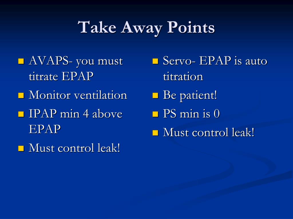 Take Away Points • AVAPS- you must titrate EPAP • Monitor ventilation • IPAP min 4 above EPAP • Must control leak! • Servo- EPAP is auto titration • Be patient! • PS min is 0 • Must control leak!