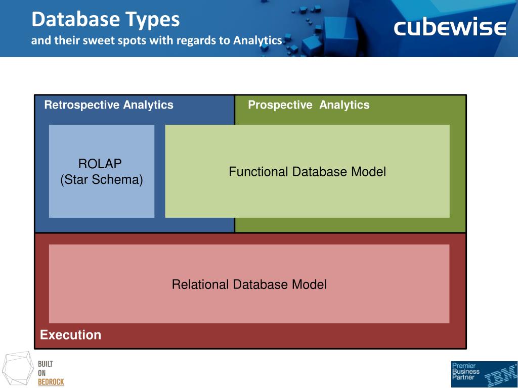 Database Typesand their sweet spots with regards to Analytics Retrospective Analytics Prospective Analytics ROLAP (Star Schema) Functional Database Model Relational Database Model Execution
