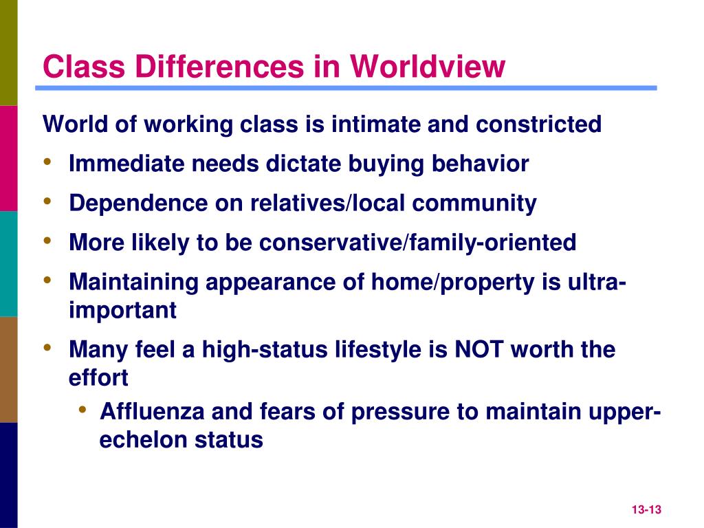 Class Differences in Worldview World of working class is intimate and constricted • Immediate needs dictate buying behavior • Dependence on relatives/local community • More likely to be conservative/family-oriented • Maintaining appearance of home/property is ultra-important • Many feel a high-status lifestyle is NOT worth the effort • Affluenza and fears of pressure to maintain upper-echelon status