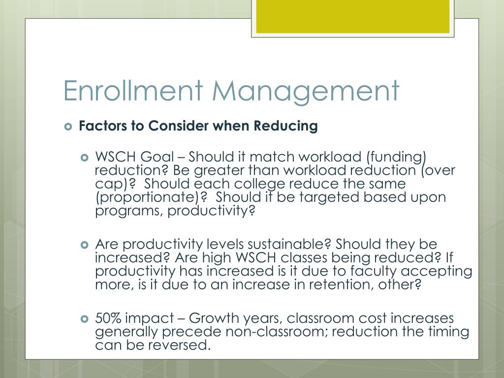 Enrollment Management • Factors to Consider when Reducing • WSCH Goal – Should it match workload (funding) reduction? Be greater than workload reduction (over cap)? Should each college reduce the same (proportionate)? Should it be targeted based upon programs, productivity? • Are productivity levels sustainable? Should they be increased? Are high WSCH classes being reduced? If productivity has increased is it due to faculty accepting more, is it due to an increase in retention, other? • 50% impact – Growth years,classroom cost increases generally precede non-classroom; reduction the timing can be reversed.
