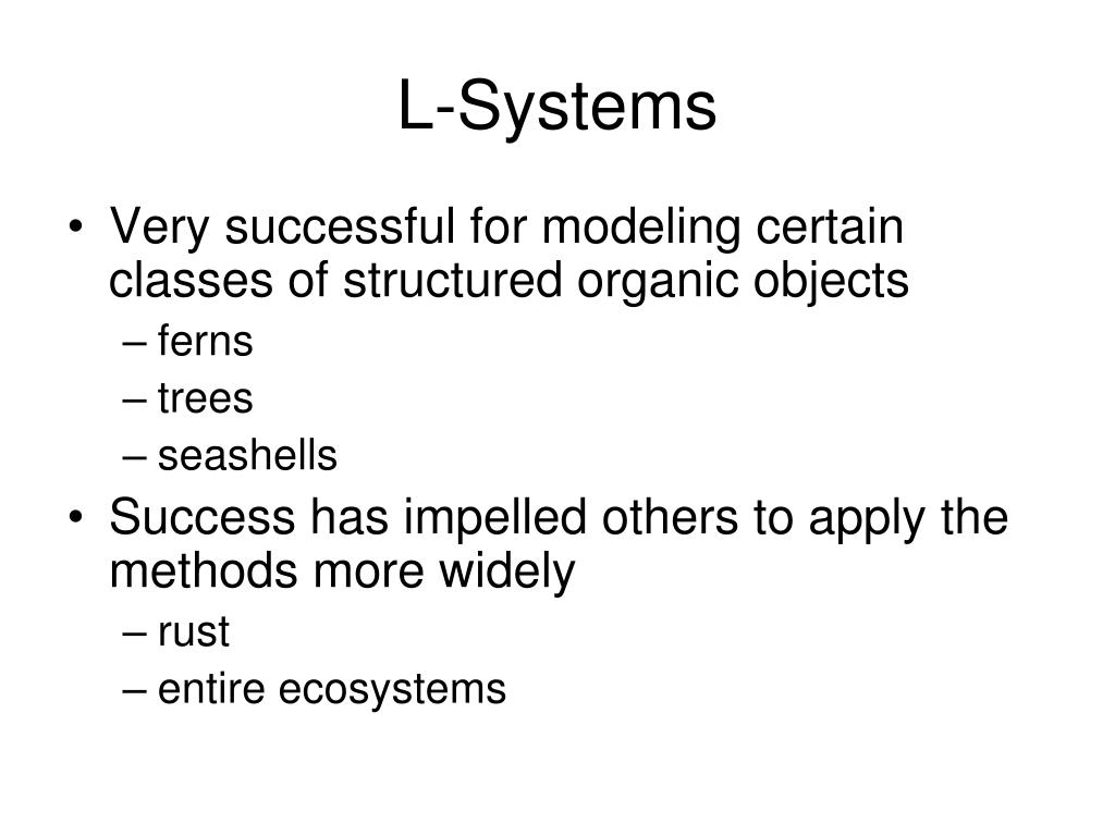 L-Systems • Very successful for modeling certain classes of structured organic objects • ferns • trees • seashells • Success has impelled others to apply the methods more widely • rust • entire ecosystems