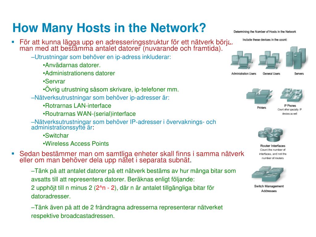 How Many Hosts in the Network? • För att kunna lägga upp en adresseringsstruktur för ett nätverk börjar man med att bestämma antalet datorer (nuvarande och framtida). • Utrustningar som behöver en ip-adress inkluderar: • Anvädarnas datorer. • Administrationens datorer • Servrar • Övrig utrustning såsom skrivare, ip-telefoner mm. • Nätverksutrustningar som behöver ip-adresser är: • Rotrarnas LAN-interface • Routrarnas WAN-(serial)interface • Nätverksutrustningar som behöver IP-adresser i övervaknings- och administrationssyfte är: • Switchar • Wireless Access Points • Sedan bestämmer man om samtliga enheter skall finns i samma nätverk eller om man behöver dela upp nätet i separata subnät. • Tänk på att antalet datorer på ett nätverk bestäms av hur många bitar som avsatts till att representera datorer. Beräknas enligt följande:2 upphöjt till n minus 2 (2^n - 2), där n är antalet tillgängliga bitar för datoradresser. • Tänk även på att de 2 fråndragna adresserna representerar nätverket respektive broadcastadressen.