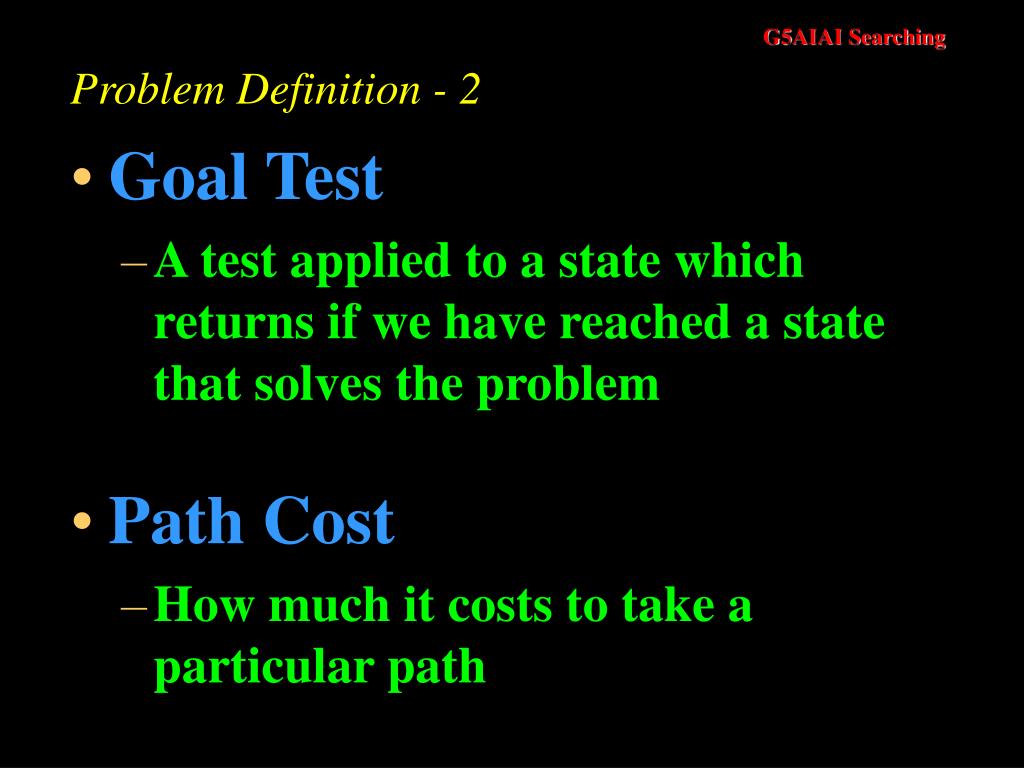 Problem Definition - 2 • Goal Test • A test applied to a state which returns if we have reached a state that solves the problem • Path Cost • How much it costs to take a particular path