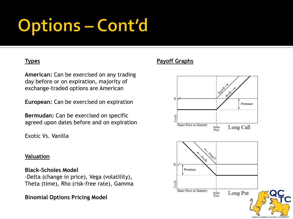 Options – Cont’d • Types • American: Can be exercised on any trading day before or on expiration, majority of exchange-traded options are American • European: Can be exercised on expiration • Bermudan: Can be exercised on specific agreed upon dates before and on expiration • Exotic Vs. Vanilla • Valuation • Black-Scholes Model • Delta (change in price), Vega (volatility), Theta (time), Rho (risk-free rate), Gamma • Binomial Options Pricing Model Payoff Graphs