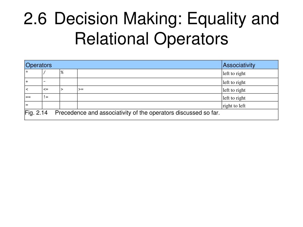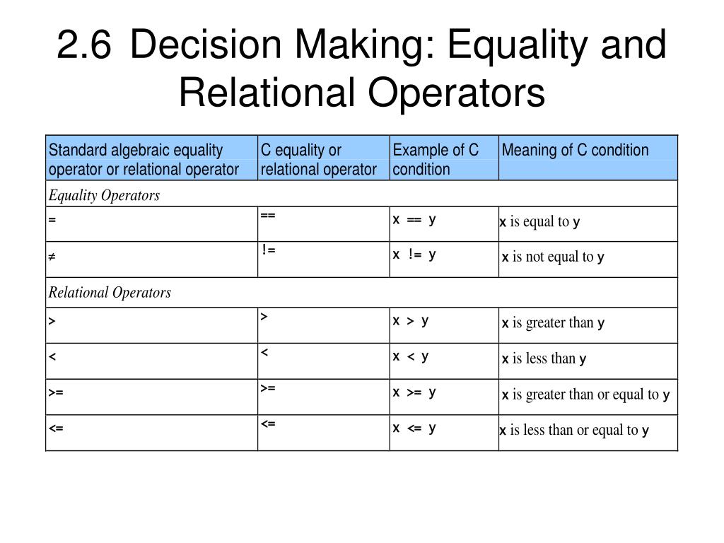 2.6 Decision Making: Equality and Relational Operators Fig. 2.13 #include <stdio.h> main() { int num1, num2; printf( "Enter two integers, and I will tell you\n the relationships they satisfy: " ); scanf( "%d %d", &num1, &num2 ); if ( num1 == num2 ) { printf( "%d is equal to %d\n", num1, num2 ); } if ( num1 != num2 ) { printf( "%d is not equal to %d\n", num1, num2 ); } if ( num1 < num2 ) { printf( "%d is less than %d\n", num1, num2 ); } if ( num1 > num2 ) { printf( "%d is greater than %d\n", num1, num2 ); } if ( num1 <= num2 ) { printf( "%d is less than or equal to %d\n", num1, num2 ); } if ( num1 >= num2 ) { printf( "%d is greater than or equal to %d\n", num1, num2 ); } return 0; }