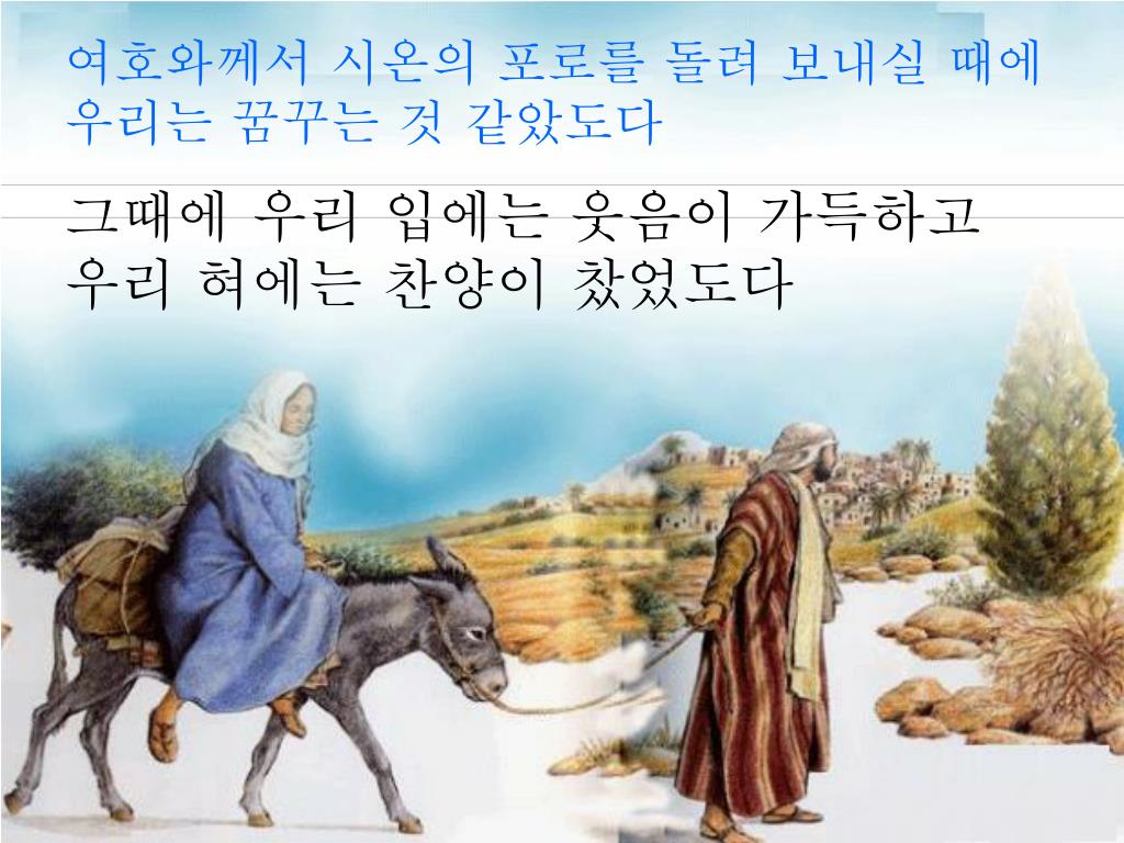 여호와께서 시온의 포로를 돌려 보내실 때에 우리는 꿈꾸는 것 같았도다 그때에 우리 입에는 웃음이 가득하고 우리 혀에는 찬양이 찼었도다