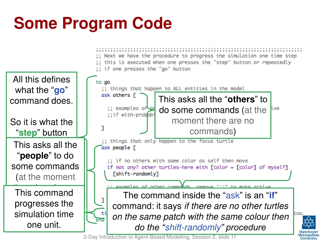 Some Program Code The command inside the “ask” is an “if” command: it says if there are no other turtles on the same patch with the same colour then do the “shift-randomly” procedure This command progresses the simulation time one unit. This asks all the “people” to do some commands (at the moment there is only one person). This asks all the “others” to do some commands (at the moment there are no commands) All this defines what the “go” command does. So it is what the “step” button does once when you click on it, or what the “go” button does repeatedly if you select it. 2-Day Introduction to Agent-Based Modelling, Session 2, slide 11