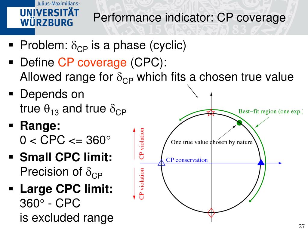 Performance indicator: CP coverage • Problem: dCP is a phase (cyclic) • Define CP coverage (CPC):Allowed range for dCP which fits a chosen true value • Depends on true q13 and true dCP • Range:0 < CPC <= 360 • Small CPC limit:Precision of dCP • Large CPC limit:360 - CPCis excluded range