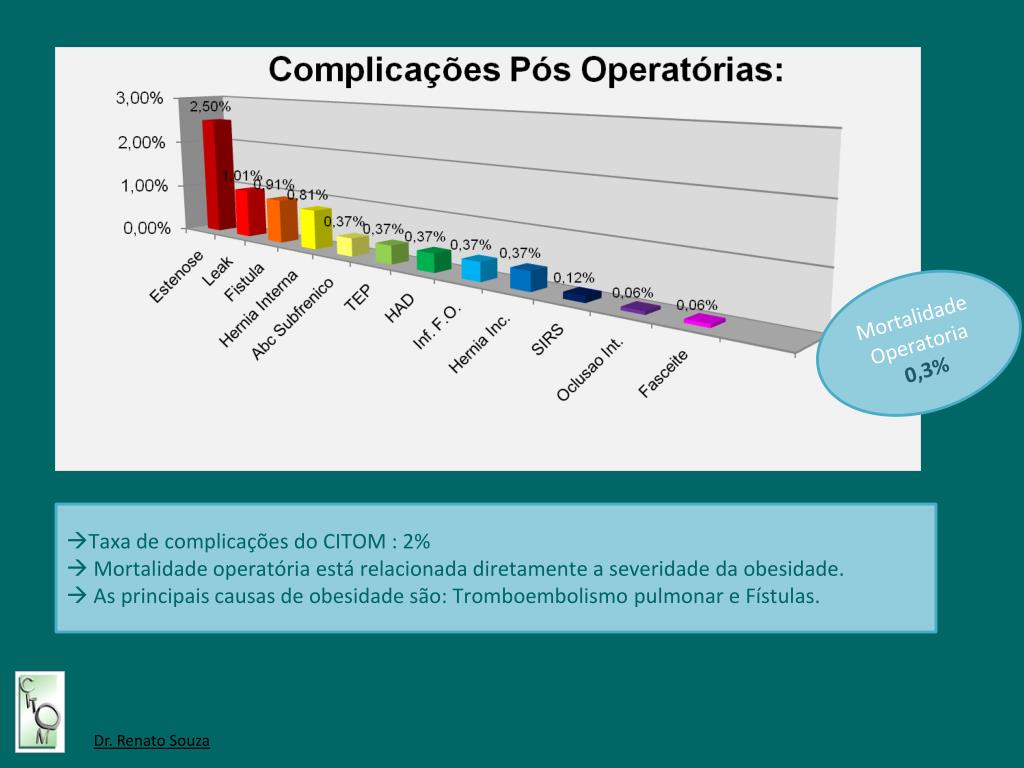Mortalidade Operatoria 0,3% • Taxa de complicações do CITOM : 2% • Mortalidade operatória está relacionada diretamente a severidade da obesidade. • As principais causas de obesidade são: Tromboembolismo pulmonar e Fístulas. Dr. Renato Souza