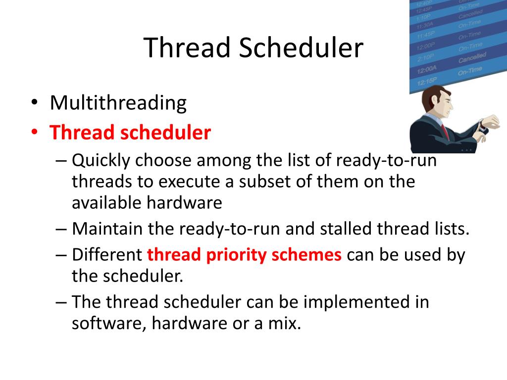 Thread Scheduler • Multithreading • Thread scheduler • Quickly choose among the list of ready-to-run threads to execute a subset of them on the available hardware • Maintain the ready-to-run and stalled thread lists. • Different thread priority schemes can be used by the scheduler. • The thread scheduler can be implemented in software, hardware or a mix.