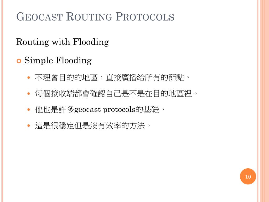 Geocast Routing Protocols Routing with Flooding • Simple Flooding • 不理會目的的地區,直接廣播給所有的節點。 • 每個接收端都會確認自己是不是在目的地區裡。 • 他也是許多geocast protocols的基礎。 • 這是很穩定但是沒有效率的方法。