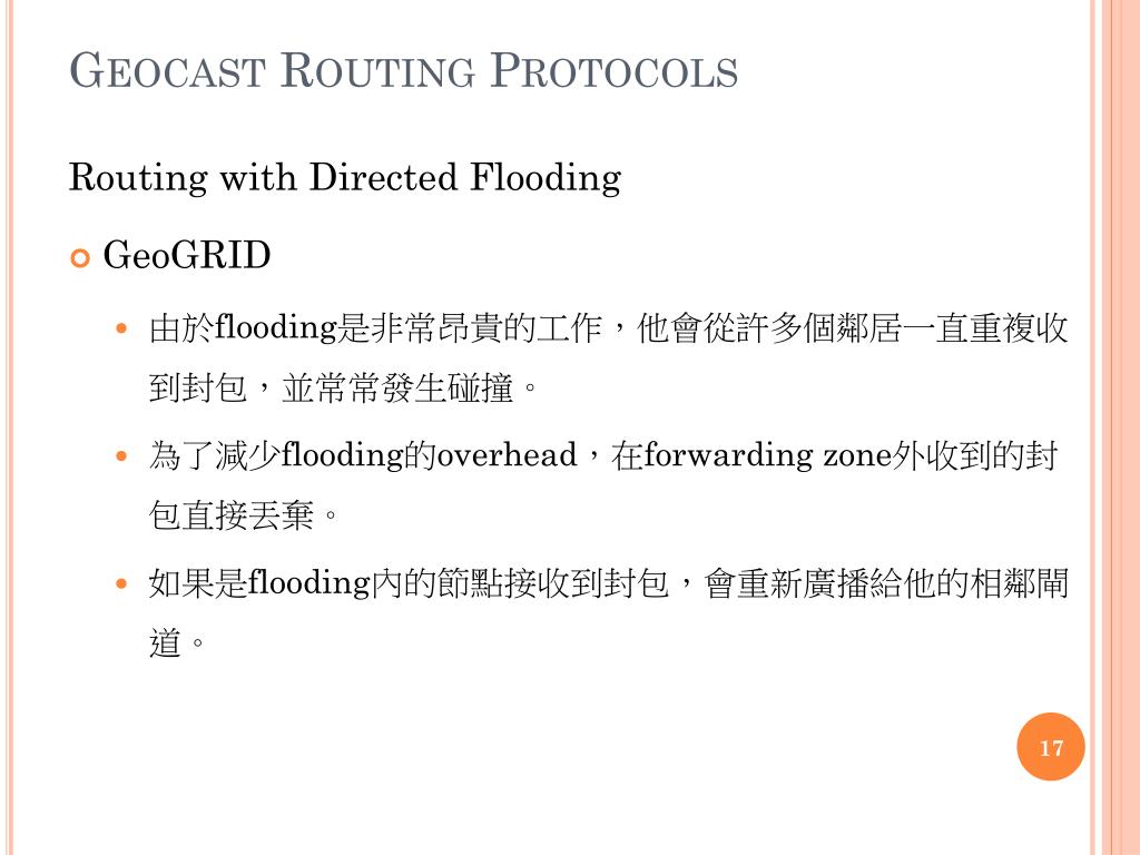 Geocast Routing Protocols Routing with Directed Flooding • Mesh • 他是使用flooding來找出多餘的路徑到達目的地,來防止主機移動和連線失敗。 • 在目的地的節點接收到初始的封包後會加入mesh,並順著原本的路徑透過unicast回覆傳送端來停止flooding。 • 每個中繼節點需要記錄並維持狀態資訊。