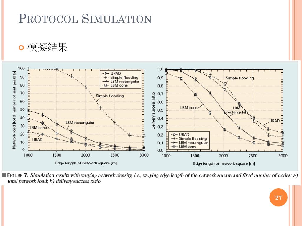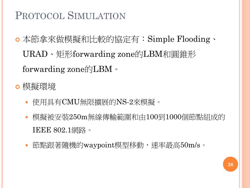 Protocol Simulation • 本節拿來做模擬和比較的協定有:Simple Flooding、URAD、矩形forwarding zone的LBM和圓錐形forwarding zone的LBM。 • 模擬環境 • 使用具有CMU無限擴展的NS-2來模擬。 • 模擬被安裝250m無線傳輸範圍和由100到1000個節點組成的IEEE 802.1網路。 • 節點跟著隨機的waypoint模型移動,速率最高50m/s。