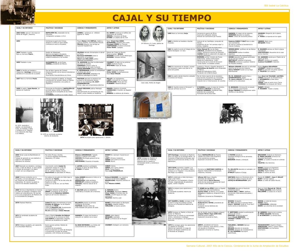 CAJAL Y SU ENTORNO CAJAL Y SU ENTORNO CAJAL Y SU ENTORNO CAJAL Y SU ENTORNO POLÍTICA Y SOCIEDAD POLÍTICA Y SOCIEDAD CIENCIA Y PENSAMIENTO CIENCIA Y PENSAMIENTO ARTES Y LETRAS ARTES Y LETRAS POLÍTICA Y SOCIEDAD POLÍTICA Y SOCIEDAD CIENCIA Y PENSAMIENTO CIENCIA Y PENSAMIENTO ARTES Y LETRAS ARTES Y LETRAS 1866 Tercer curso de Bachillerato en Huesca. Trabaja de aprendiz en una barbería y luego en una zapatería. Abandona los estudios. 1873 Santiago, licenciado en Medicina Gana una plaza en la Sanidad Militar; se incorpora al Regimiento de Burgos, que opera en la provincia de Lérida, el 3 de septiembre. 1852 CAJAL nace el 1 de mayo en Petilla de Aragón ( Navarra) 1859 Nace su hermana Jorja. Paz entre Prusia y Austria. La marina española bombardea Valparaíso y El Callao. Muere NAPOLEÓN III de Francia. Tratado de límites Chile-Argentina. Crisis económica europea. Exposición Universal en Viena. J. FOSTER estudia la necesidad.biológica de los alimentos minerales. BAKUNIN: Estado y anarquía. Etienne LANCEREAUX: Tratado histórico y práctico de la sífilis. HAECKEL:Morfología general de los organismos. WHITEHEAD: Proyecta el torpedo. BRUCKNER: Sinfonía en Remenor. B. PEREZ GALDÓS comienza los Episodios Nacionales. VERNE: La vuelta al mundo en ochenta Días. TOLSTOI: Ana Karenina. MONET:St. Germain l´Auxerrois en París. LISZT: Christus (oratorio). VERNE: De la tierra a la luna. IBSEN: Brand. Comienza la guerra de África. Guerra de unificación italiana. Anexión de Cochinchina por Francia. NAPOLEÓN III, emperador de los franceses. Inmigración europea a U.S.A. DARWIN: El origen de las especies. NIEMANN descubre la cocaína. MARX: Crítica de economía política. LASSELL construye un reflector gigante en Malta. GOUNOD: Margarita (de la ópera Fausto). V. HUGO: La leyenda de los siglos. Ch. BARRY construye el edificio del Parlamento de Londres. MENZEL: Concierto de flauta.STOWE: La cabaña del tío Tom 1853 1860 La familia se traslada a Ayerbe (Huesca). Victoria de los Castillejos, conquista de Tetuán. Expedición de los “mil camisas rojas” a Sicilia y Calabria. Rusia funda la ciudad de Vladivostok. Comienza la guerra de Crimea. Teodoro II unifica el reino etíope. Conferencia naval en Bruselas. Federico RUBIO Y GALÍ lleva a cabo una ovariotomía. Se crea en Londres la Socidad de la Ciencia Cristiana. Muere Mateo J. B. ORFILA, médico y químico español, nacionalizado francés. PRAVAZ propone una jeringa de inyección hipodérmica. INGRES: Baño turco. BÉCQUER: Rimas. Nace Vicent Van GOGH. SCHUMANN: Fantasía para violín. Giuseppe VERDI: La Travista. CAMPOAMOR: El drama Universal. Víctor HUGO: Castigos. 1867 Reanuda sus estudios y consigue asistir a clase de dibujo, su gran pasión a cambio de prometer a su padre cumplir con sus obligaciones. Insurrección contra Isabel II; sangriento choque en Linás de Marcuello, próximo a Ayerbe. EE.UU. compra Alaska a Rusia. Maximiliano es ejecutado en México. J. LISTER practica la antisepsia mediante el spray de ácido fénico. K. MARX: El Capital. COROT: Reims. VERDI: Don Carlos (ópera) ZOLA: Teresa Raquin. Nace Luigi PIRANDELLO. 1874 CAJAL asciende a capitán y es destinado a Cuba; se traslada a Cádiz y embarca en el “España”. A los dieciocho días llega a La Habana. Proclama de MARTINEZ CAMPOS en Sagunto restaurando la monarquía. Indochina, francesa. Th. BILLROTH descubre el estrepto y el estafilococo. STANLEY explora el Congo. MONET: Verano en Argenteuil. MUSSORGSKI: Borís Godunov. VALERA: Pepita Jiménez. ZOLA: El vientre de París. 1861 Su padre le envía al Colegio de los Padres Escolapios en Jaca. Victor Manuel II, rey de Italia. LINCOLN, presidente de los Estados Unidos; comienza la guerra de Secesión. JUAREZ decide la suspensión de pagos de la deuda extranjera. SEMMELWEIS:`profilaxis de las fiebres puerperales. KIRCHHOFF realiza el análisis espectral. Descubrimiento del arqueopterigio. R. WAGNER estrena en París la ópera Tannhäuser. DOSTOIEVSKI: Recuerdos de la casa de los muertos. 1854 Traslado a Larrés. Nace su hermano Pedro. Asedio de Sebastopol. Apertura de Japón a Occidente. Florence NIGTHINGALE funda la moderna asistencia a los heridos. VELPEAU estudia clínicamente el cáncer de Mama. Bernhard RIEMANN funda la geometría no euclidiana. Albert von KÖLLIKER publica Anatomía microscópica. Palacio de Cristal en Munich. Muere el pintor BEGAS. WAGNER: El anillo de los Nibelungos. DICKENS: Tiempos difíciles. 1875 Es destinado a Vista Hermosa y luego a San Isidro. Cae enfermo y es trasladado a Puerto Príncipe; diagnosticado de paludismo agudo, vuelve a España. 1868 Primeros contactos con la fotografía, a la que descubre en Huesca por medio de unos fotógrafos ambulantes. En verano, su padre le inicia en los estudios anatómicos. Se subleva la escuadra de Cádiz bajo la dirección de Topete. Comienza la guerra de los diez años de España en Cuba. Guerra en los EE.UU. con los Pieles Rojas. Alfonso XII llega a España. Asesinato del dictador de Ecuador.Gabriel García Moreno. Venta de las acciones egipcias del Canal de Suez a Gran Bretaña. HERTWIG observa el fenómeno de la fecundación sobre el huevo de erizo. LECOQ de BOISBAUDRAN: galio. Jules JANSEN descubre el helio en la masa del sol. MENDELEIEV: tabla periódica. BERTHELOT sintetiza el acetileno. HAECKEL: Historia natural de la creación. Richard WAGNER: Los maestros cantores de Nürnberg (ópera). BAUDELAIRE: Pequeños poemas en prosa. Nace Máximo GORKI. Mueren C. COROT y Jean F. MILLET BIZET: Carmen (ópera). ZOLA: La caída del abateMouret. 1862 BISMARK, primer ministro de Prusia. Sublevación polaca contra Rusia. Batalla de Frederckburg (USA). Construcción de la linea de ferrocarril “Unión Pacific” en Estados Unidos. KÜHNE descubre las placas terminales de los nervios motores. BERTHELOT sintetiza el benceno. SPENCER comienza a publicar Sistema de Filosofía sintética. Ch. GARNIER construye el Teatro de la Ópera de París. MILLE
