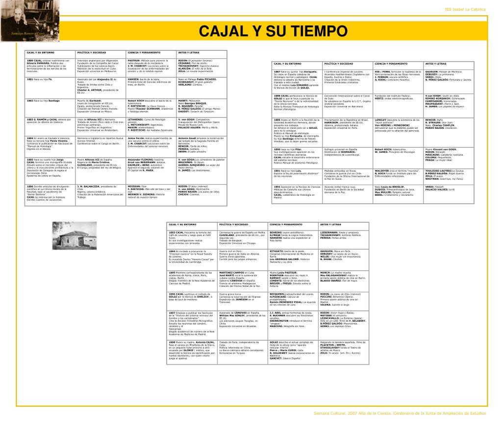 CAJAL Y SU ENTORNO CAJAL Y SU ENTORNO CAJAL Y SU ENTORNO POLÍTICA Y SOCIEDAD POLÍTICA Y SOCIEDAD POLÍTICA Y SOCIEDAD CIENCIA Y PENSAMIENTO CIENCIA Y PENSAMIENTO CIENCIA Y PENSAMIENTO ARTES Y LETRAS ARTES Y LETRAS ARTES Y LETRAS 1904 Termina Textura del sistema nervioso del hombre y de los vertebrado, Tomo II. 1910 CANALEJAS le nombra senador vitalicio. 1899 La Universidad de Clark, Worcester (Massachussets) invita a CAJAL a dar tres conferencias. Llega a Nueva York; es nombrado Doctor “Honoris Causa”. Publica Textura del sistema nervioso del hombre y de los vertebrados. Publica Reglas y consejos sobre la investigación biológica. Guerra ruso-japonesa. Congreso de la Internacional socialista en Amsterdam. Olimpiada y Exposición en San Luis. Proclamación de la República en Portugal. Francia adquiere el África Ecuatorial. Fundación del Fondo Carnegie de Paz Internacional. Exposición Universal en Bruselas. Alemania obtiene las islas Carolinas. Guerra anglo-bóer. Sudán condominio angloegipcio. Muere Robert KOCH en Baden-Baden de una enfermedad cardíaca. El príncipe Alberto I de Mónaco funda el Instituto de Oceanografía. Paul NATORP: Las bases lógicas de Las Ciencias exactas. Sigmund FREUD: Primeras aportaciones a la teoría de la neurosis. HAECKEL: Los enigmas del universo. R. MENÉNDEZ PIDAL, catedrático de filología románica en Madrid. BOVERI: cromosomas. Hmnos. LUMIÈRE: fotografía en colores naturales. MONET: Catedral de Rouen. SIBELIUS: Sinfonía en Mi menor. El proceso Dreyfus,filme de G. MÉLIÈS. P. VALDÉS: La hermana San Sulpicio. GORKI: Foma Gordeev. G. BRAQUE: Sacre Coeur. BARTOK: Allegro barbaro. Lucrecia Borgia, filme de GUAZZONI. Eduardo MARQUINA: En Flandes se ha puesto el sol. Nace Savador DALÍ. PUCCINI: Madame Buterfly. Paría la nuit,filme de L. GAUMONT. VALLE INCLÁN: Flor de Santidad. CHEJOV: El jardín de los cerezos. 1905 La Academia de Ciencias de Berlín le concede la medalla Helmholtz. CAJAL estudia la estructura de los ganglios sensitivos y simpáticos. Publica Cuentos de vacaciones. Primera revolución rusa. Noruega se separa de Suecia. El Kaiser Guillermo II desembarca en Tánger, y declara la soberanía del sultán. División de Bengala (India) en dos provincias. SHERRINGTON y PHILIPSSON: Reflejo de extensión cruzado. EINSTEIN: Teoría general de la relatividad. H. GROSS: Psicología criminal. PICASSO: Familia de Saltimbanquis. FALLA: La vida breve. El hotel eléctrico, filme de S. CHOMÓN. Rubén DARÍO: Cantos de vida y esperanza. E. WHARTON: La casa de la alegría. 1911 Muere su hijo Santiago de una grave afección cardíaca. Guerra italo-turca. Porfirio DÍAZ, de México, se retira al exilio en París. Acuerdo franco-alemán sobre el Congo. Revolución de los jóvenes chinos. A.BETHE descubre que el ácido láctico no es la sustancia determinante de la contracción muscular. RUTHERFORD: modelo de átomo. BURSTYN: tanque. Mona Lisa, de Leonardo da VINCI, esrobado del Museo del Louvre. RAVEL: La hora española. Ana Karenina, filme de TSCHARDININE. E. D´ORS: La bien plantada. 1900 CAJAL, premio de Moscú. En España se le concede la Gran Cruz de Isabel la Católica y poco después recibía La Gran Cruz de Alfonso XII. Es nombrado director del Instituto Nacional deHigiene “Alfonso XII”, recién fundado. Asesinato de Humberto I de Italia. Rusia ocupa Manchuria. Rebelión de los bóxers en China; matanza de misioneros. Olimpiada y Exposición en París. H. WINTERSTEIN descubre la respiración del nervio en actividad. LANDSTEINER: grupos sanguíneos. FREUD: La interpretación de los sueños. DEGAS: El violinista. PUCCINI: Tosca. Juana de Arco, filme de F. MÉLIÈS. ECHEGARAY: El loco Dios. RILKE: Historia del buen Dios. 1906 El Presidente del Gobierno, MORET solicita de CAJAL su asesoramiento en materia educativa y le ofrece ser ministrode Instrucción Pública. El día 10 de diciembre le conceden el Premio Nobel de Fisiología y Medicina. Alfonso XIII,rey de España, contrae matrimonio con Victoria Eugenia de BATTENBERG. Conferencia de Algeciras (zonas de influencia España- Francia, en Marruecos). Fundación del Kuomitang (China). SCHMIDTMANN: Manual de medicina forense. Fundación de la Sociedad psicoanalítica de Viena. Kart DIEHL: Sobre el socialismo, comunismo y anarquismo. Muere Paul CÉZANNE. BUSONI: Concierto para piano. Creación de la Hispano Films. E. D´ORS: Glosaría. SHAW: El dilema del doctor. 1912 Se trasladaa la casa de Alfonso XII. Publica La fotografía de los colores. Asesinato de CANALEJAS. Tratado naval entre Francia y Rusia. Sublevación en Cuba; llegan tropas Norteamericanas. Marruecos, Protectorado francés. Hundimiento del “Titanic” Muere OLÓRIZ. Alfred ADLER: Del temperamento nervioso. CHAGALL: El viejo mercader. R. STRAUSS: Ariadna y Naxos. La conquista del Polo,filme de G. MÉLIÈS. AZORÍN: Castilla. F. KAFKA: Relatos. 1901 Se crea el Laboratorio de Investigaciones Científicas,un centro dedicado a la investigación, siendo nombrado CAJAL director del mismo. Su Revista Trimestral aparece ahora, anualmente, con el nombre de Trabajosdel Laboratorio de Investigaciones Biológicas. Muere la reina Victoria de Inglaterra. Theodore ROOSEVELT, presidente de los EE.UU. Política de “puerta abierta” a China. K. PEYTRÉN descubre el cruzamiento de las fibras transmisoras de la sensibilidad dolorosa. DUTTON descubre el agente de la enfermedad del sueño. DVORAK: Russalka. Quo vadis, filme de F. ZECCA. B.PÉREZ GALDÓS: Electra. SHAW: César y Cleopatra. 1913 Publica Estudios sobre la degeneración y regeneración del Sistema nervioso.(Tomo I) Asesinato de Jorge I de Grecia. Woodrow WILSON, presidente de los EE.UU. Emily DAVISON y Silvia PANKHURST luchan por el sufragio femenino. Niels BOHR: Ensayo sobre la construcción del átomo. Aparece en Italia el cuadro robado (Mona Lisa), de Leonardo da Vinci. STRAWINSKY:La consagración de la primavera. Th. MANN: Muerte en Venecia. 1907 CAJAL colabora en la creació