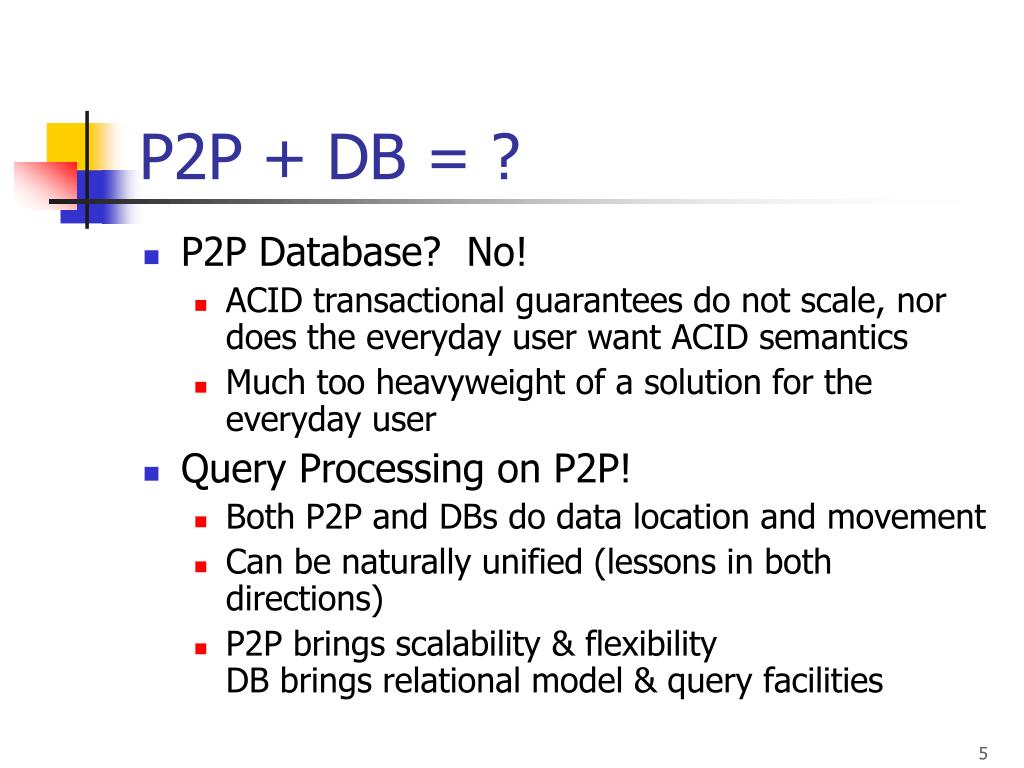 P2P + DB = ? • P2P Database? No! • ACID transactional guarantees do not scale, nor does the everyday user want ACID semantics • Much too heavyweight of a solution for the everyday user • Query Processing on P2P! • Both P2P and DBs do data location and movement • Can be naturally unified (lessons in both directions) • P2P brings scalability & flexibilityDB brings relational model & query facilities