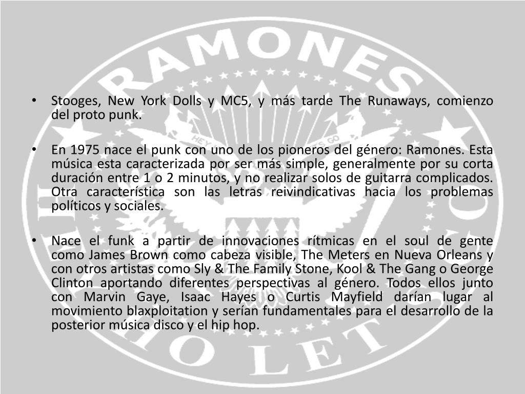 Stooges, New York Dolls y MC5, y más tarde The Runaways, comienzo del proto punk. • En 1975 nace el punk con uno de los pioneros del género: Ramones. Esta música esta caracterizada por ser más simple, generalmente por su corta duración entre 1 o 2 minutos, y no realizar solos de guitarra complicados. Otra característica son las letras reivindicativas hacia los problemas políticos y sociales. • Nace el funk a partir de innovaciones rítmicas en el soul de gente como James Brown como cabeza visible, The Meters en Nueva Orleans y con otros artistas como Sly & The Family Stone, Kool & The Gang o George Clinton aportando diferentes perspectivas al género. Todos ellos junto con Marvin Gaye, Isaac Hayes o Curtis Mayfield darían lugar al movimiento blaxploitation y serían fundamentales para el desarrollo de la posterior música disco y el hip hop.