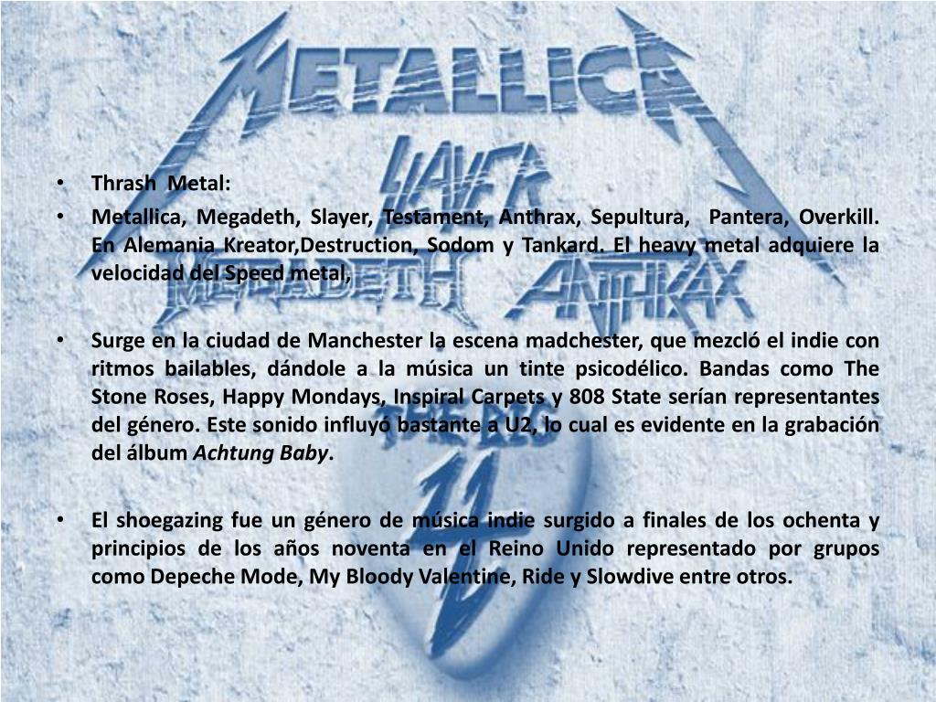 Thrash Metal: • Metallica, Megadeth, Slayer, Testament, Anthrax, Sepultura, Pantera, Overkill. En Alemania Kreator,Destruction, Sodom y Tankard. El heavy metal adquiere la velocidad del Speed metal, • Surge en la ciudad de Manchester la escena madchester, que mezcló el indie con ritmos bailables, dándole a la música un tinte psicodélico. Bandas como The Stone Roses, Happy Mondays, Inspiral Carpets y 808 State serían representantes del género. Este sonido influyó bastante a U2, lo cual es evidente en la grabación del álbum Achtung Baby. • El shoegazing fue un género de música indie surgido a finales de los ochenta y principios de los años noventa en el Reino Unido representado por grupos como Depeche Mode, My Bloody Valentine, Ride y Slowdive entre otros.
