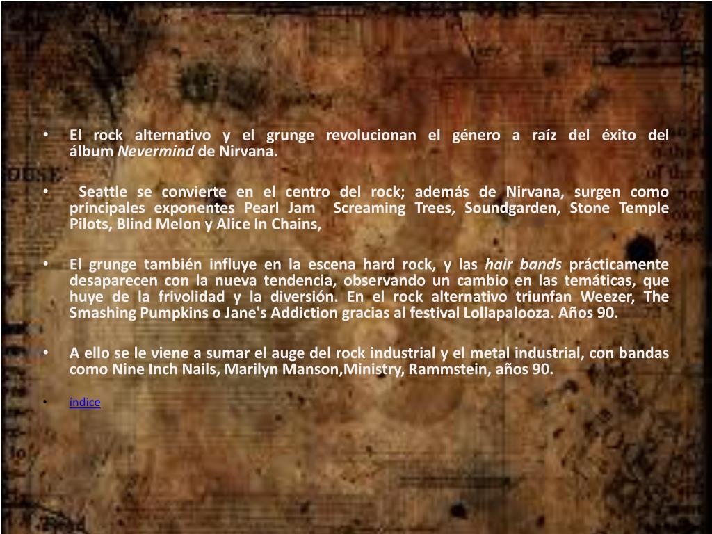El rock alternativo y el grunge revolucionan el género a raíz del éxito del álbum Nevermind de Nirvana. • Seattle se convierte en el centro del rock; además de Nirvana, surgen como principales exponentes Pearl Jam Screaming Trees, Soundgarden, Stone Temple Pilots, Blind Melon y Alice In Chains, • El grunge también influye en la escena hard rock, y las hair bands prácticamente desaparecen con la nueva tendencia, observando un cambio en las temáticas, que huye de la frivolidad y la diversión. En el rock alternativo triunfan Weezer, The Smashing Pumpkins o Jane's Addiction gracias al festival Lollapalooza. Años 90. • A ello se le viene a sumar el auge del rock industrial y el metal industrial, con bandas como Nine Inch Nails, Marilyn Manson,Ministry, Rammstein, años 90. • índice