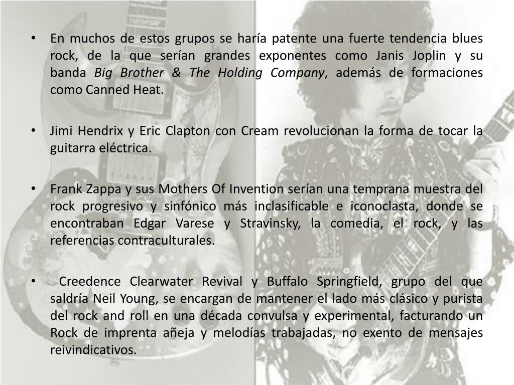 En muchos de estos grupos se haría patente una fuerte tendencia blues rock, de la que serían grandes exponentes como Janis Joplin y su banda Big Brother & The Holding Company, además de formaciones como Canned Heat. • Jimi Hendrix y Eric Clapton con Cream revolucionan la forma de tocar la guitarra eléctrica. • Frank Zappa y sus Mothers Of Invention serían una temprana muestra del rock progresivo y sinfónico más inclasificable e iconoclasta, donde se encontraban Edgar Varese y Stravinsky, la comedia, el rock, y las referencias contraculturales. • Creedence Clearwater Revival y Buffalo Springfield, grupo del que saldría Neil Young, se encargan de mantener el lado más clásico y purista del rock and roll en una década convulsa y experimental, facturando un Rock de imprenta añeja y melodías trabajadas, no exento de mensajes reivindicativos.