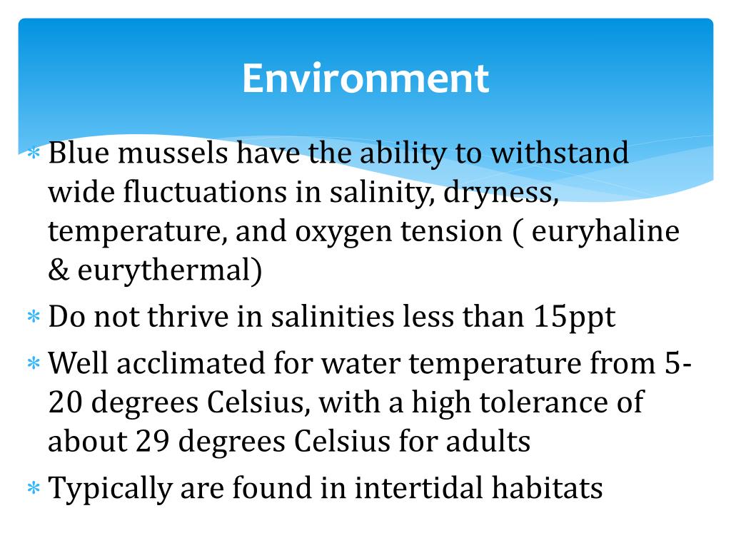 Environment Blue mussels have the ability to withstand wide fluctuations in salinity, dryness, temperature, and oxygen tension ( euryhaline & eurythermal) Do not thrive in salinities less than 15ppt Well acclimated for water temperature from 5-20 degrees Celsius, with a high tolerance of about 29 degrees Celsius for adults Typically are found in intertidal habitats