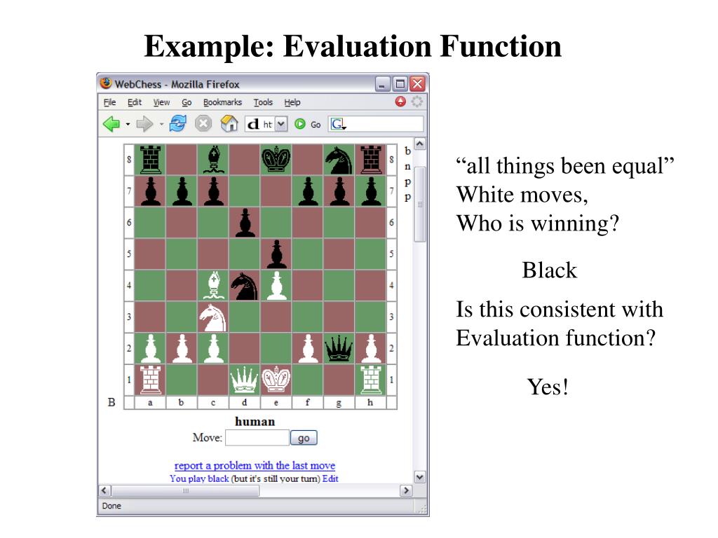 Example: Evaluation Function “all things been equal” White moves, Who is winning? Is this consistent with Evaluation function? Black Yes!