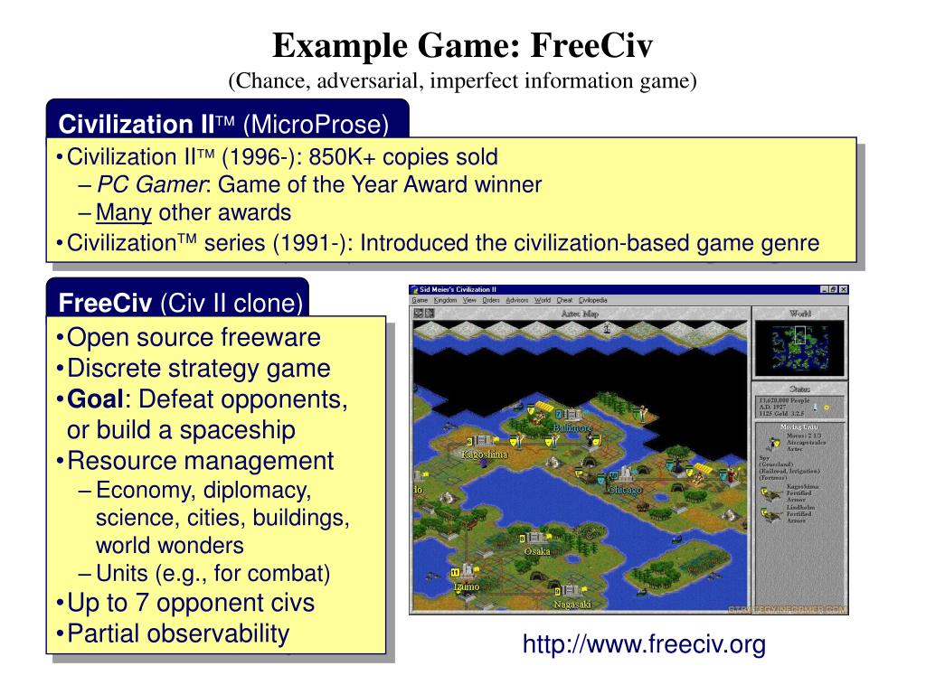 Example Game: FreeCiv(Chance, adversarial, imperfect information game) Civilization II(MicroProse) • Civilization II (1996-): 850K+ copies sold • PC Gamer: Game of the Year Award winner • Many other awards • Civilization series (1991-): Introduced the civilization-based game genre FreeCiv (Civ II clone) • Open source freeware • Discrete strategy game • Goal: Defeat opponents, or build a spaceship • Resource management • Economy, diplomacy, science, cities, buildings, world wonders • Units (e.g., for combat) • Up to 7 opponent civs • Partial observability http://www.freeciv.org