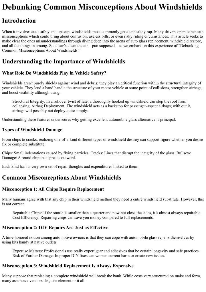Debunking Common Misconceptions About Windshields Introduction When it involves auto safety and upkeep, windshields most commonly get a unhealthy rap. Many drivers operate beneath misconceptions which could bring about confusion, useless bills, or even risky riding circumstances. This article seeks to make clear the ones misunderstandings through diving deep into the arena of auto glass replacement, windshield restore, and all the things in among. So allow’s clean the air—pun supposed—as we embark on this experience of “Debunking Common Misconceptions About Windshields.” Understanding the Importance of Windshields What Role Do Windshields Play in Vehicle Safety? Windshields aren't purely shields against wind and debris; they play an critical function within the structural integrity of your vehicle. They lend a hand handle the structure of your motor vehicle at some point of collisions, strengthen airbags, and boost visibility although using. Structural Integrity: In a rollover twist of fate, a thoroughly hooked up windshield can stop the roof from collapsing. Airbag Deployment: The windshield acts as a backstop for passenger-aspect airbags; with out it, airbags will possibly not deploy quite simply. Understanding these features underscores why getting excellent automobile glass alternative is principal. Types of Windshield Damage From chips to cracks, realizing one-of-a-kind different types of windshield destroy can support figure whether you desire fix or complete substitute. Chips: Small indentations caused by flying particles. Cracks: Lines that disrupt the integrity of the glass. Bullseye Damage: A round chip that spreads outward. Each kind has its very own set of repair thoughts and expenditures linked to them. Common Misconceptions About Windshields Misconception 1: All Chips Require Replacement Many humans agree with that any chip in their windshield method they need a entire windshield substitute. However, this is not correct. Repairable Chips: If the smash is smaller than a quarter and now not close the sides, it’s almost always repairable. Cost Efficiency: Repairing chips can save you money compared to full replacements. Misconception 2: DIY Repairs Are Just as Effective A time-honored notion among automotive owners is that they can cope with automobile glass repairs themselves by using kits handy at native outlets. Expertise Matters: Professionals use really expert gear and adhesives that be certain longevity and safe practices. Risk of Further Damage: Improper DIY fixes can worsen current harm or create new issues. Misconception 3: Windshield Replacement Is Always Expensive Many suppose that replacing a complete windshield will break the bank. While costs vary structured on make and form, many assurance vendors disguise element or it all.
