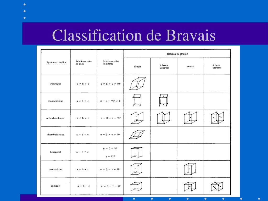Les 7 réseaux de base • Triclinique (6 paramètres) • Monoclinique (4) • Orthorhombique (3) • Quadratique (2) • Cubique (1) • Hexagonal (1) • Rhomboédrique (2)