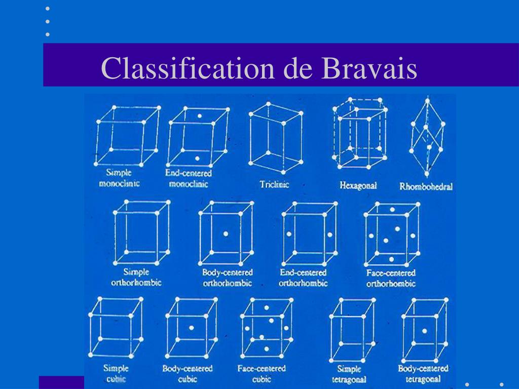 Les variantes Variantes Réseau de base bases centrées (BC) + faces centrées (FC) centrée (C) 4 variantes/réseau au total 14 réseaux de Bravais