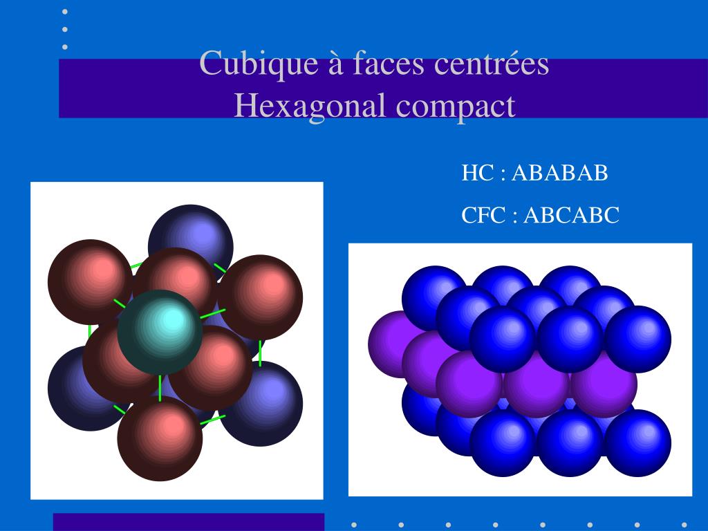 Cubique à faces centréesHexagonal compact HC : ABABAB ou ACACAC CFC : ABCABC