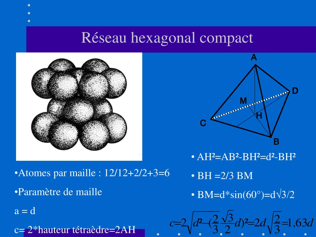 Réseau hexagonal compact • AH²=AB²-BH²=d²-BH² • BH =2/3 BM • BM=d*sin(60°)=d√3/2 • Atomes par maille : 12/12+2/2+3=6 • Paramètre de maille • a = d • c= 2*hauteur tétraèdre=2AH