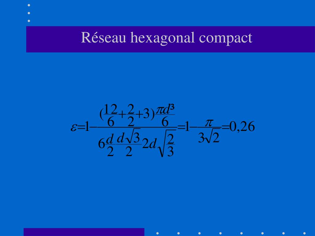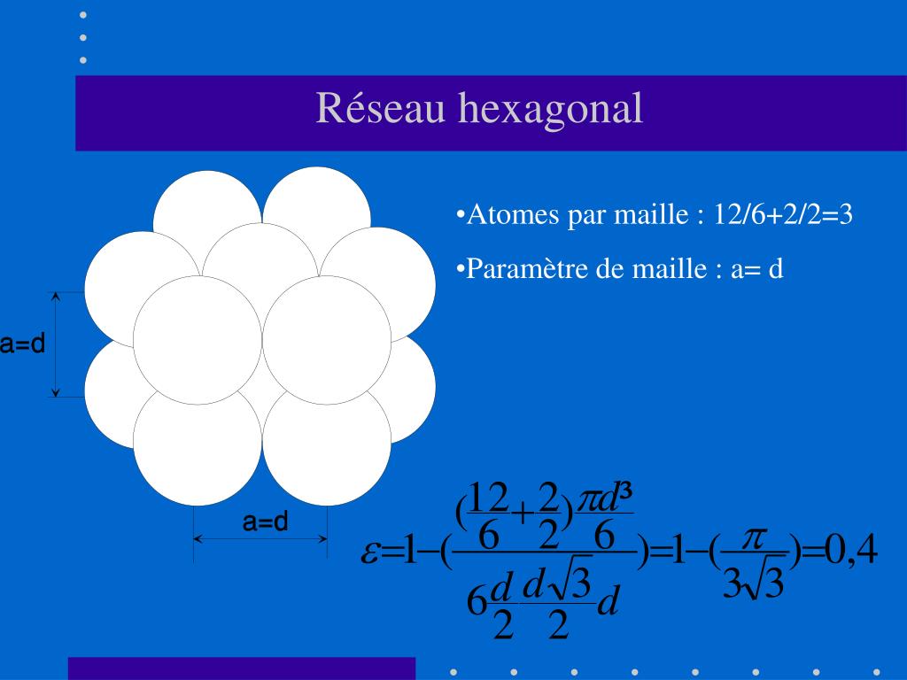 Réseau hexagonal • Atomes par maille : 12/6+2/2=3 • Paramètre de maille : a= d