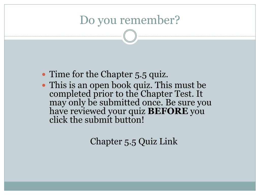 Do you remember? • Time for the Chapter 5.5 quiz. • This is an open book quiz. This must be completed prior to the Chapter Test. It may only be submitted once. Be sure you have reviewed your quiz BEFORE you click the submit button! Chapter 5.5 Quiz Link