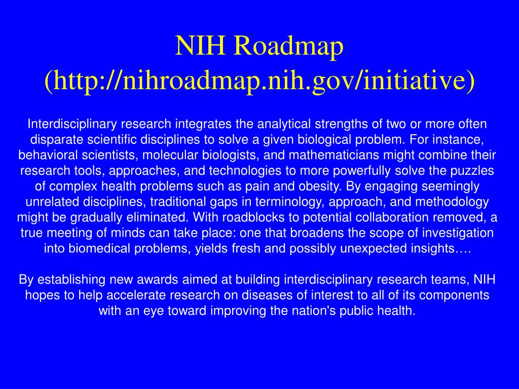 NIH Roadmap (http://nihroadmap.nih.gov/initiative) Interdisciplinary research integrates the analytical strengths of two or more often disparate scientific disciplines to solve a given biological problem. For instance, behavioral scientists, molecular biologists, and mathematicians might combine their research tools, approaches, and technologies to more powerfully solve the puzzles of complex health problems such as pain and obesity. By engaging seemingly unrelated disciplines, traditional gaps in terminology, approach, and methodology might be gradually eliminated. With roadblocks to potential collaboration removed, a true meeting of minds can take place: one that broadens the scope of investigation into biomedical problems, yields fresh and possibly unexpected insights…. By establishing new awards aimed at building interdisciplinary research teams, NIH hopes to help accelerate research on diseases of interest to all of its components with an eye toward improving the nation's public health.