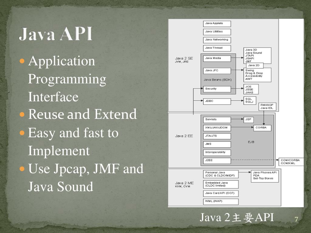Java API • Application Programming Interface • Reuse and Extend • Easy and fast to Implement • Use Jpcap, JMF and Java Sound Java 2主要API