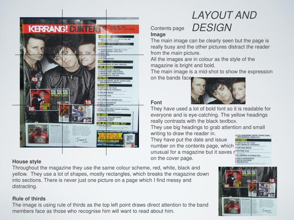 LAYOUT AND DESIGN Contents page Image The main image can be clearly seen but the page is really busy and the other pictures distract the reader from the main picture. All the images are in colour as the style of the magazine is bright and bold. The main image is a mid-shot to show the expression on the bands faces. Font They have used a lot of bold font so it is readable for everyone and is eye-catching. The yellow headings really contrasts with the black textbox. They use big headings to grab attention and small writing to draw the reader in. They have put the date and issue number on the contents page, which is unusual for a magazine but it saves room on the cover page. House style Throughout the magazine they use the same colour scheme, red, white, black and yellow. They use a lot of shapes, mostly rectangles, which breaks the magazine down into sections. There is never just one picture on a page which I find messy and distracting. Rule of thirds The image is using rule of thirds as the top left point draws direct attention to the band members face as those who recognise him will want to read about him.