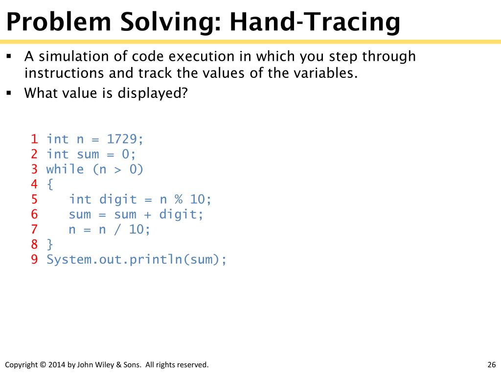 A simulation of code execution in which you step through instructions and track the values of the variables. What value is displayed? 1intn = 1729; 2intsum = 0; 3 while (n > 0) 4 { 5int digit = n % 10; 6sum = sum + digit; 7n = n / 10; 8 } 9System.out.println(sum); Problem Solving: Hand-Tracing