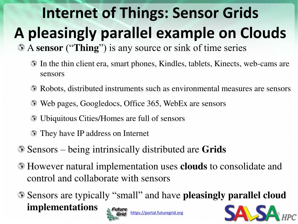 Internet of Things: Sensor GridsA pleasingly parallel example on Clouds • A sensor (“Thing”) is any source or sink of time series • In the thin client era, smart phones, Kindles, tablets, Kinects, web-cams are sensors • Robots, distributed instruments such as environmental measures are sensors • Web pages, Googledocs, Office 365, WebEx are sensors • Ubiquitous Cities/Homes are full of sensors • They have IP address on Internet • Sensors – being intrinsically distributed are Grids • However natural implementation uses clouds to consolidate and control and collaborate with sensors • Sensors are typically “small” and have pleasingly parallel cloud implementations