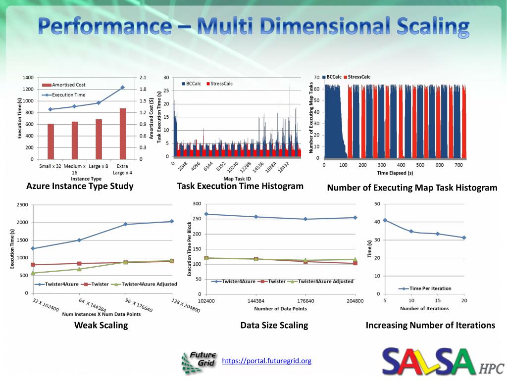 Performance – Multi Dimensional Scaling Azure Instance Type Study Task Execution Time Histogram Number of Executing Map Task Histogram Performance with/without data caching Speedup gained using data cache Weak Scaling Data Size Scaling Increasing Number of Iterations Scaling speedup Increasing number of iterations