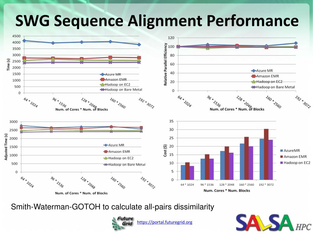 MapReduceRoles4Azure • Use distributed, highly scalable and highly available cloud services as the building blocks. • Azure Queues for task scheduling. • Azure Blob storage for input, output and intermediate data storage. • Azure Tables for meta-data storage and monitoring • Utilize eventually-consistent , high-latency cloud services effectively to deliver performance comparable to traditional MapReduce runtimes. • Minimal management and maintenance overhead • Supports dynamically scaling up and down of the compute resources. • MapReduce fault tolerance • http://salsahpc.indiana.edu/mapreduceroles4azure/