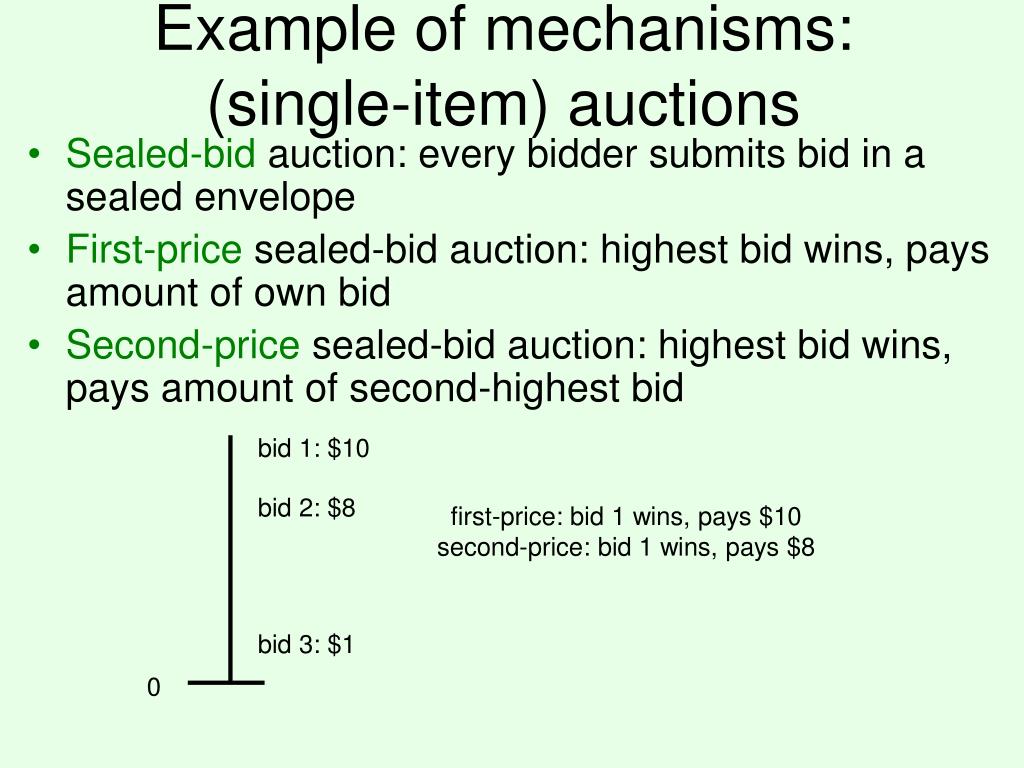 Example of mechanisms: (single-item) auctions • Sealed-bid auction: every bidder submits bid in a sealed envelope • First-price sealed-bid auction: highest bid wins, pays amount of own bid • Second-price sealed-bid auction: highest bid wins, pays amount of second-highest bid bid 1: $10 bid 2: $8 first-price: bid 1 wins, pays $10 second-price: bid 1 wins, pays $8 bid 3: $1 0