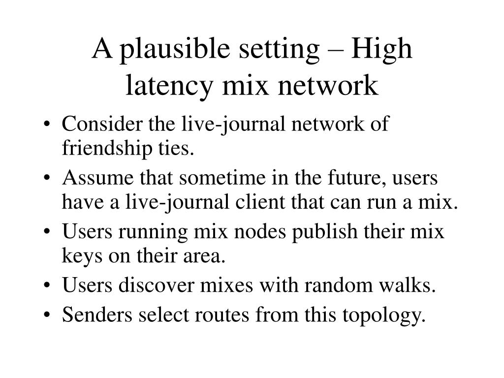 A plausible setting – High latency mix network • Consider the live-journal network of friendship ties. • Assume that sometime in the future, users have a live-journal client that can run a mix. • Users running mix nodes publish their mix keys on their area. • Users discover mixes with random walks. • Senders select routes from this topology.