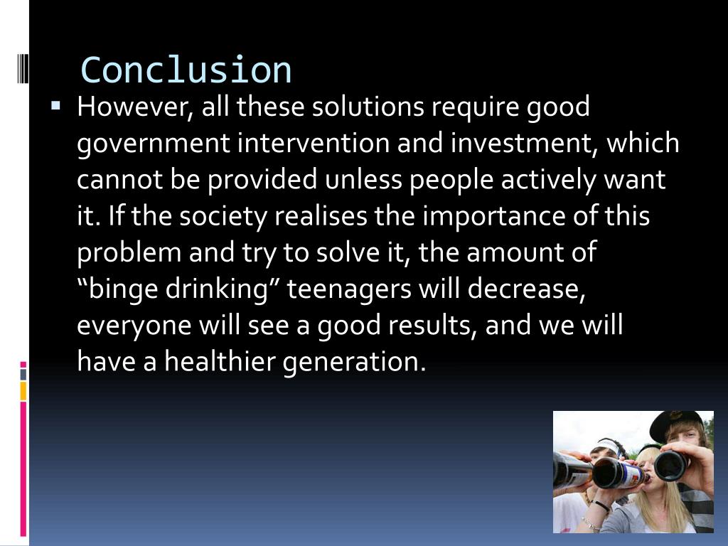 Conclusion • However, all these solutions require good government intervention and investment, which cannot be provided unless people actively want it. If the society realises the importance of this problem and try to solve it, the amount of “binge drinking” teenagers will decrease, everyone will see a good results, and we will have a healthier generation.