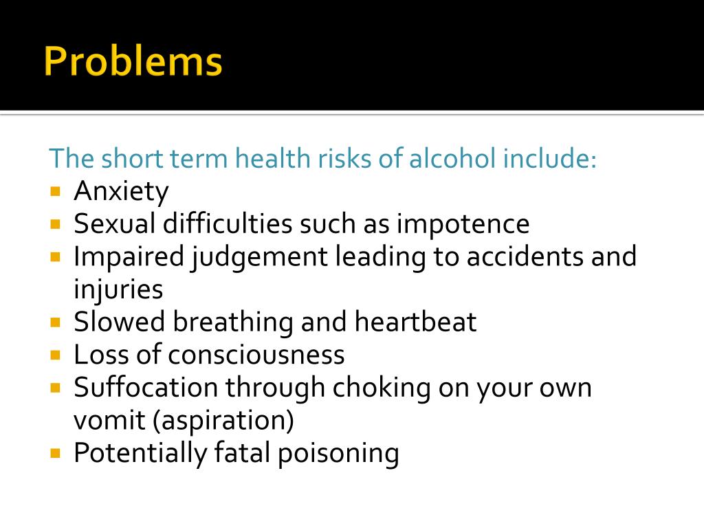 Problems The short term health risks of alcohol include: • Anxiety • Sexual difficulties such as impotence • Impaired judgement leading to accidents and injuries • Slowed breathing and heartbeat • Loss of consciousness • Suffocation through choking on your own vomit (aspiration) • Potentially fatal poisoning