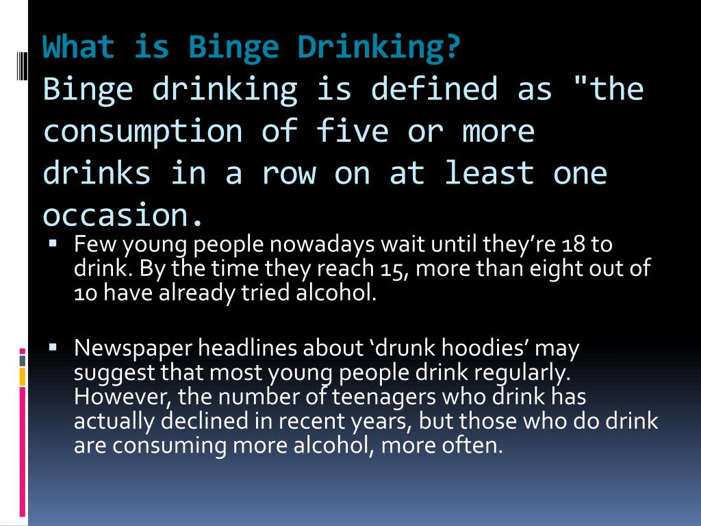 What is Binge Drinking?Binge drinking is defined as "the consumption of five or more drinks in a row on at least one occasion. • Few young people nowadays wait until they’re 18 to drink. By the time they reach 15, more than eight out of 10 have already tried alcohol. • Newspaper headlines about ‘drunk hoodies’ may suggest that most young people drink regularly. However, the number of teenagers who drink has actually declined in recent years, but those who do drink are consuming more alcohol, more often.